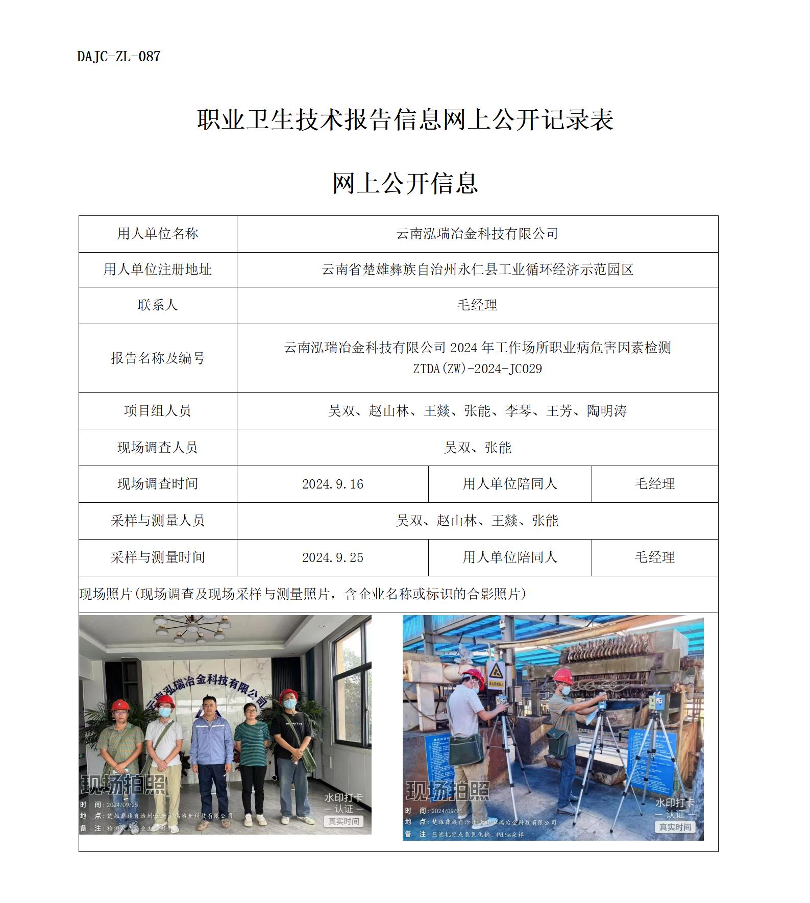 云南泓瑞冶金科技有限公司2024年工作場(chǎng)所職業(yè)病危害因素檢測(cè) ZTDA(ZW)-2024-JC029