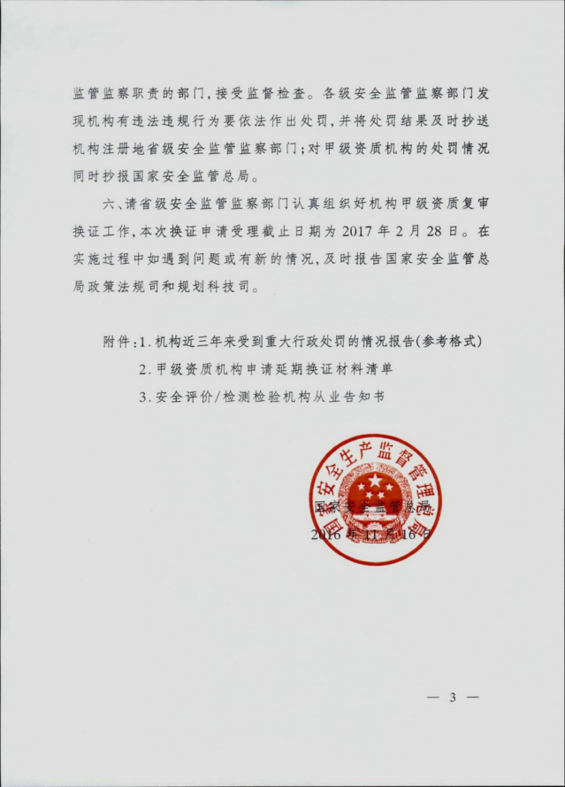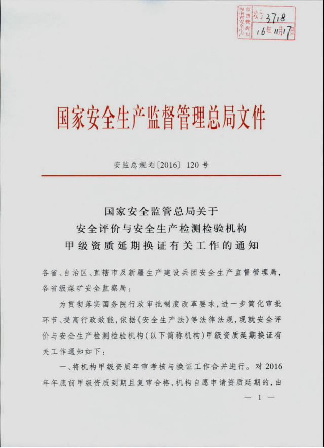 《國家安全監(jiān)管總局關(guān)于安全評價與安全生產(chǎn)檢測檢驗機構(gòu)甲級資質(zhì)延期換證有關(guān)工作的通知》