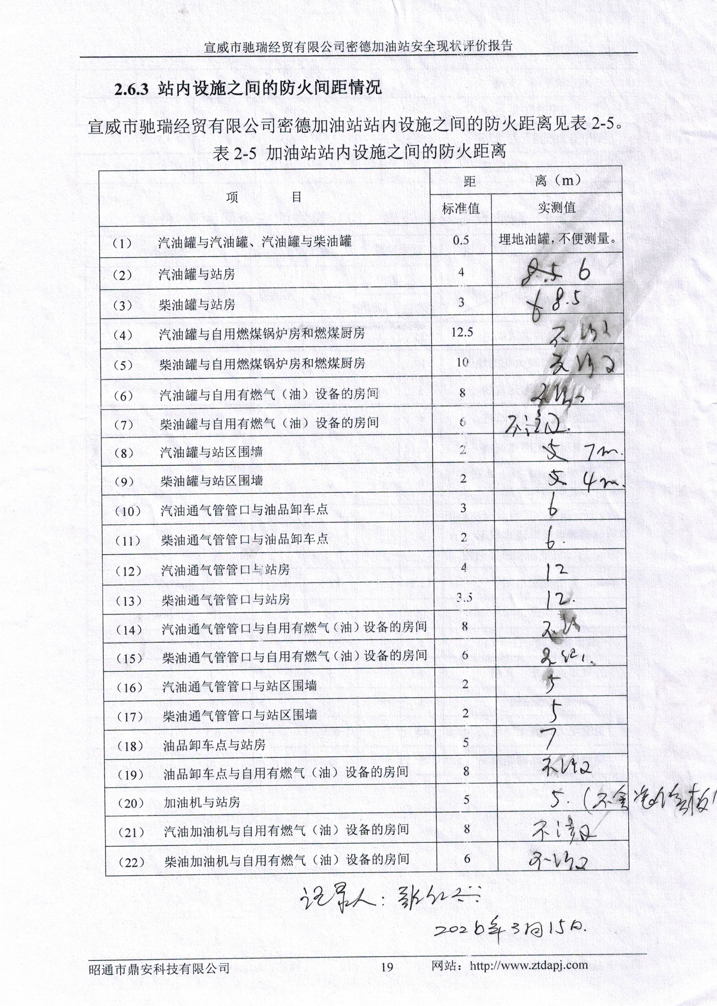 評價結論為:宣威市馳瑞經貿有限公司密德加油站已完成本次評價發(fā)現的不符合項整改,站址選擇及平面布置、加油工藝及設施、消防設施、電氣及報警系統(tǒng)、建(構)筑物等方面符合《汽車加油加氣加氫站技術標準》(GB50156-2021)、《加油站作業(yè)安全規(guī)范》(AQ3010-2022)標準規(guī)定;經營場所、危險化學品儲存設施、人員配置及培訓考核、安全管理制度、安全操作規(guī)程、應急預案、應急物資等滿足《危險化學品安全管理條例》(國務院令第591號,第645號修改)第三十四條、《危險化學品經營許可證管理辦法》(原國家安監(jiān)總局令第55號公布,第79號修正)第六條要求,從安全的角度宣威市馳瑞經貿有限公司密德加油站具備危險化學品經營的安全條件。 | ||||||||