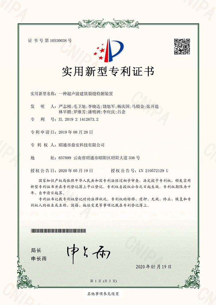 10530038一種超聲波建筑裂縫檢測裝置20200519實(shí)用新型專利證書
